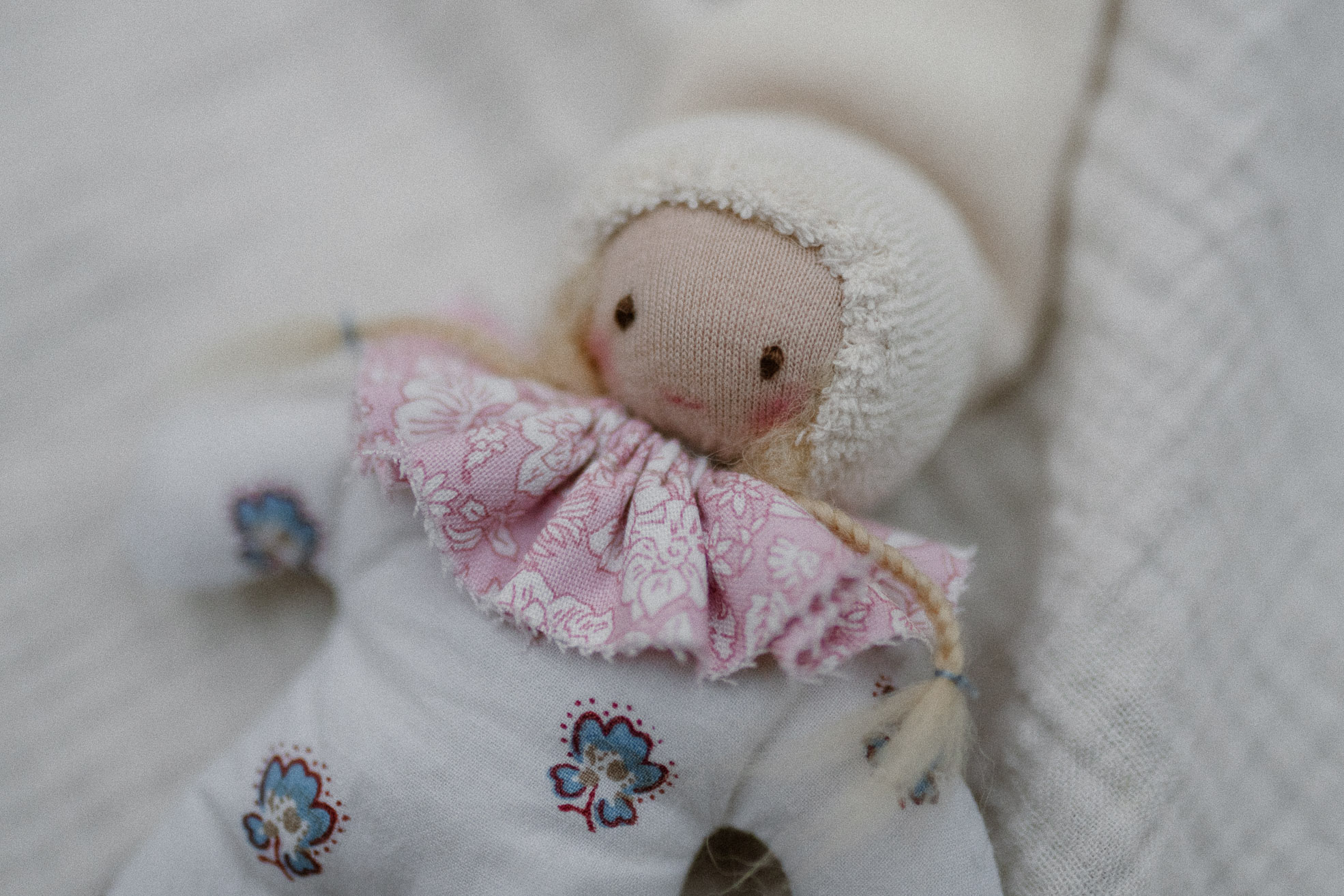 Little doll Pippa ~ Lief klein lappenpopje van gerecycled katoen/wol/linnen. Gevuld met merinowol. Dit lieve popje is zacht en klein wat precies in de kinderhandjes past. Lengte 20 cm.